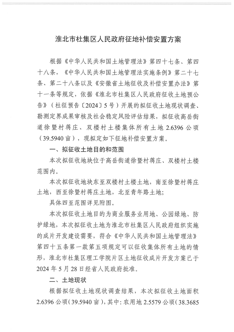 淮北市杜集區(qū)2024年第15批次(工礦廢棄地復(fù)墾掛鉤)村莊建設(shè)用地征地補(bǔ)償安置方案