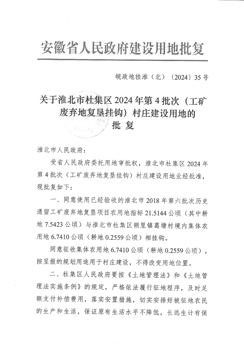 關(guān)于杜集區(qū)2024年第4批次(工礦廢棄地復(fù)墾掛鉤)村莊建設(shè)用地的批復(fù)