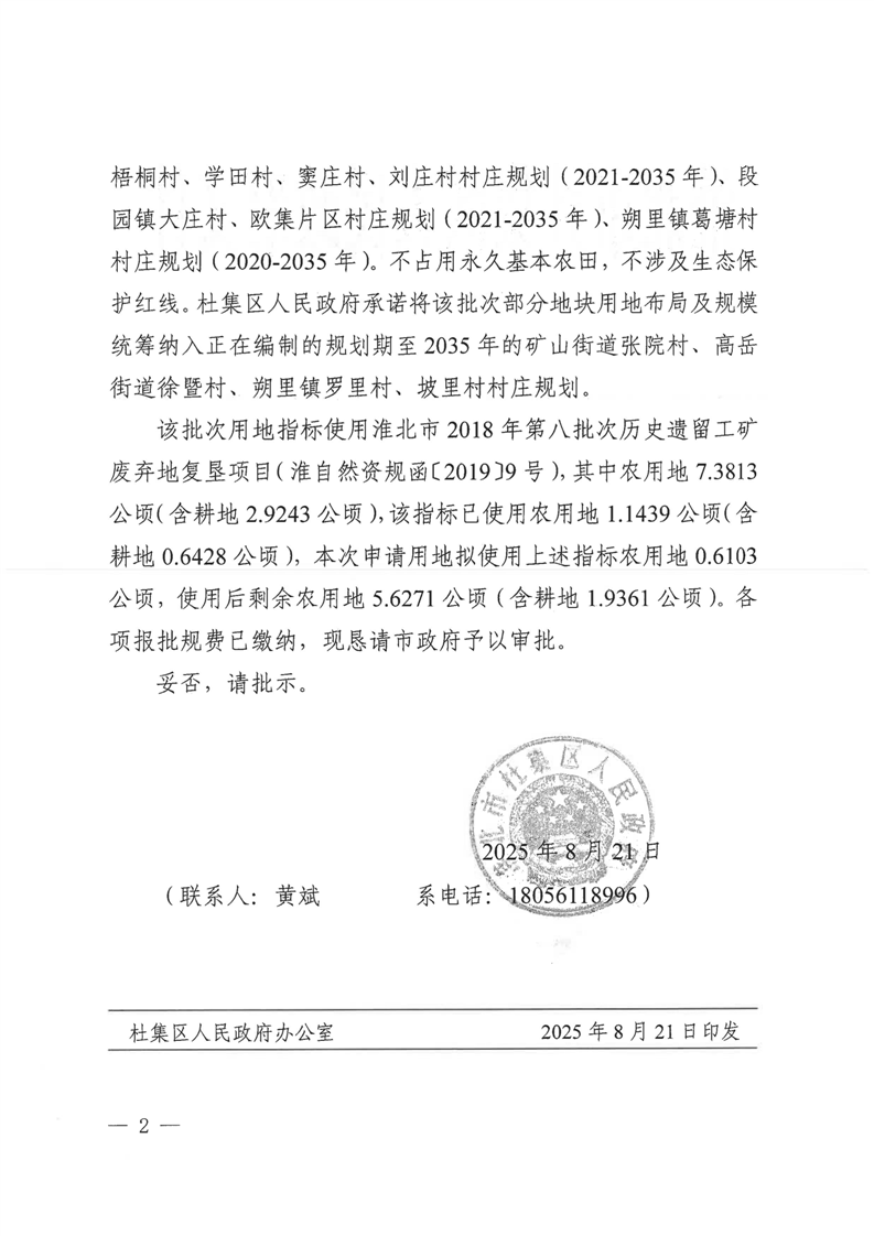 杜集區(qū)人民政府關于淮北市杜集區(qū)2025年第6批次(工礦廢棄地復墾掛鉤)村莊建設用地的請示